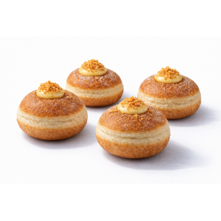Pączek z gładkim wnętrzem Crème Brûlée i chrupiącą posypką z karmelowych płatków – złociste, kruszone francuskie prażynki dodają delikatnej, karmelowo-waniliowej tekstury, która świetnie kontrastuje z kremową słodyczą. Rzemieślniczy smak, prosta jakość – Naturalnie Wyhodowane.